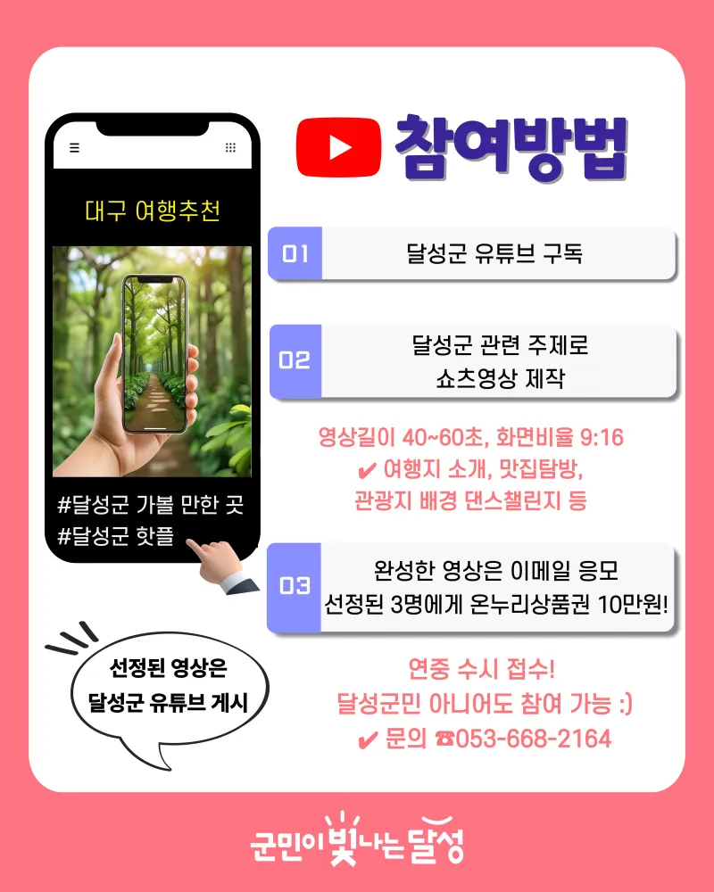 ✔ 영상 내용과 형식은 자유롭게! 관광지 배경 댄스 챌린지, 관광지·시설·사업 소개, 체험 모습, 풍경, 분야별 달성군민들의 일상 모습 등
