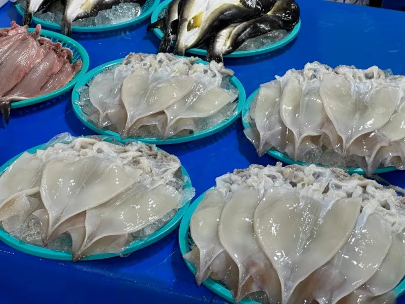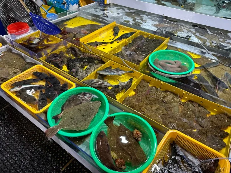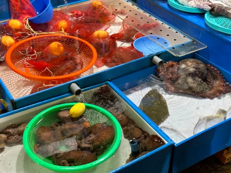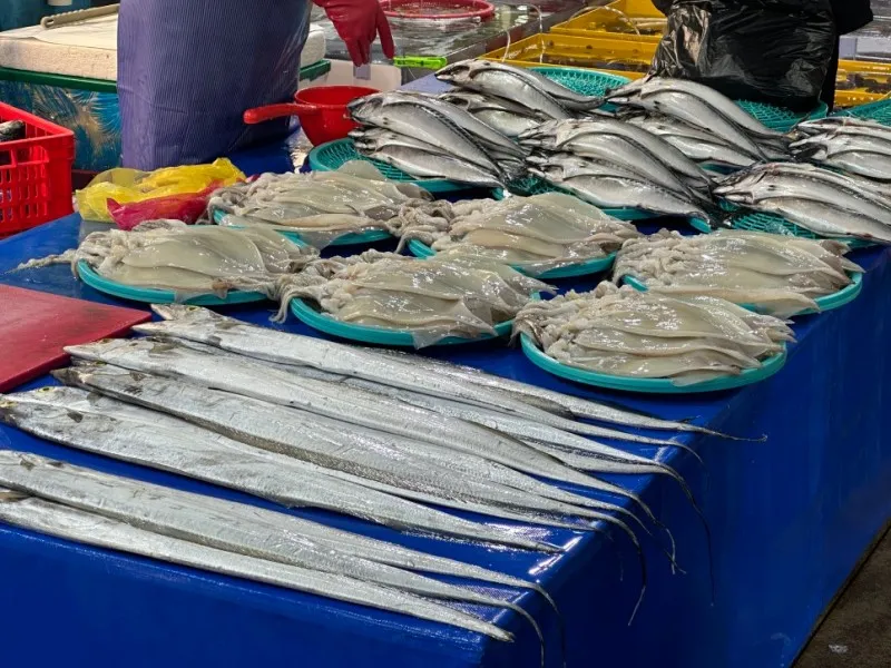 통로 간격이 넓은 편이라 쾌적하게 다닐 수 있고 지붕이 설치되어 있어서 날씨에 구애받지 않고 해산물 쇼핑이 가능합니다.