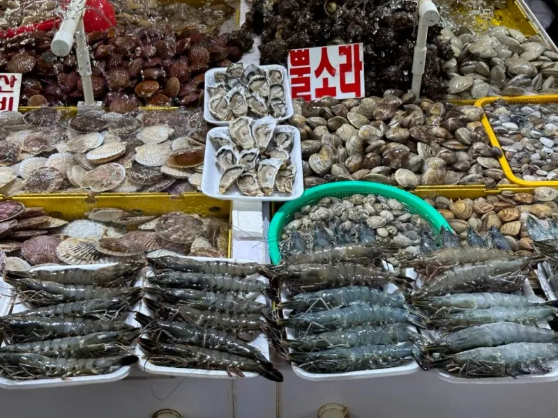 뿔소라, 가리비, 굴, 다양한 조개 외에도 튼실한 새우가 눈길을 사로잡습니다.