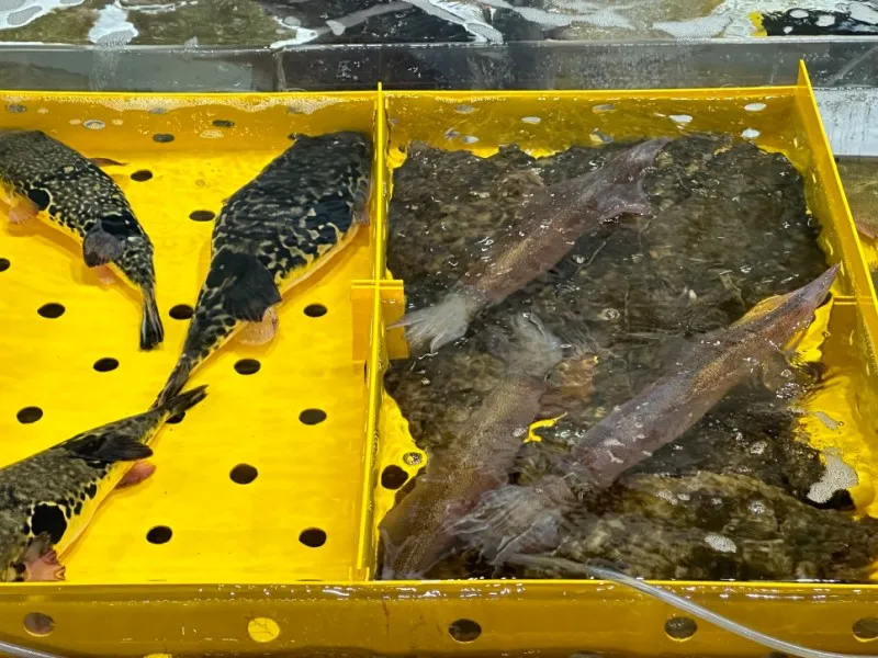 새우 대신 복어가 가판대를 지배하고 있습니다.