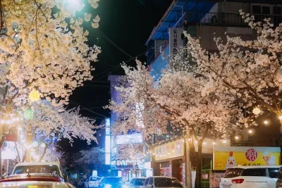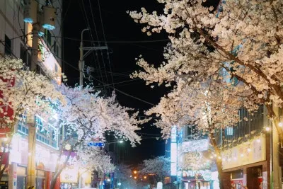 상점가의 불빛과 벚꽃의 색이 자연스레 어울리며