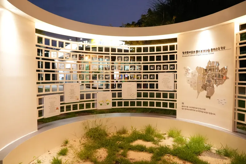 광장 앞에는 칠곡할매글꼴이 아코디언 형식의 조형물에 소개되어 있습니다.