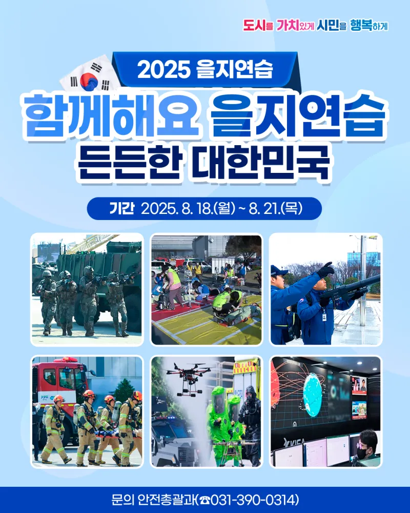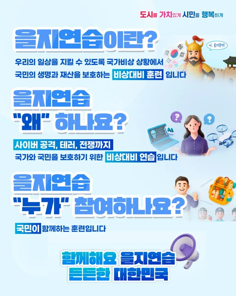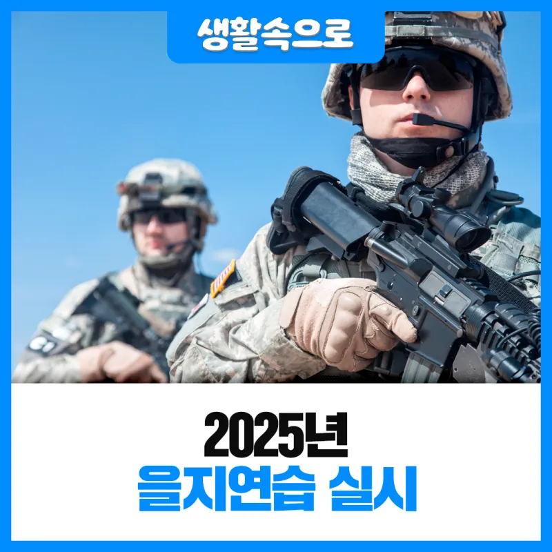 평소처럼 출근하고, 아이를 학교에 보내고, 장을 보러 가는 일상이 언제든 흔들릴 수 있는 순간이 찾아올 수 있습니다. 그럴 때 가장 중요한 것은 신속하고 정확하게 대응하는 준비입니다. 을지연습은 바로 그 준비를 위한 훈련입니다. 전쟁, 재난, 테러와 같은 국가적 위기 상황을 가정하고, 국민의 생명과 재산을 지키기 위해 정부와 지자체, 군, 유관기관이 함께 대응 절차를 점검하고 실습하는 비상대비 훈련이죠. 2025년 8월 18일 월요일부터 8월 21일 목요일까지 을지연습이 시행되오니 시민 여러분도 함께 관심을 가지고 참여해 주시기 바랍니다.