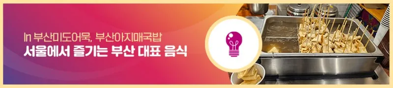 어묵 하면 부산 어묵이 먼저 떠오르듯이 서울역과 용산역에서 만날 수 있는 부산미도어묵과, 부산에서 시작하여 가맹점으로 전국에 체인점을 두고 있는 부산아지매국밥을 소개하겠습니다.