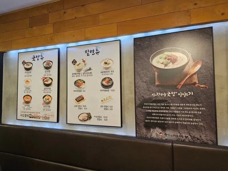 부산 아지매국밥의 주메뉴는 부산 대표 음식인 돼지국밥과 밀면입니다.