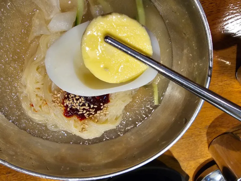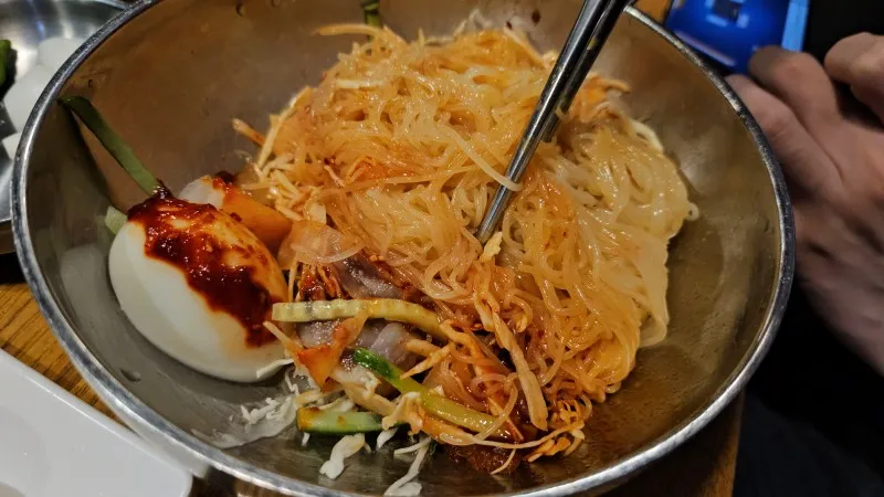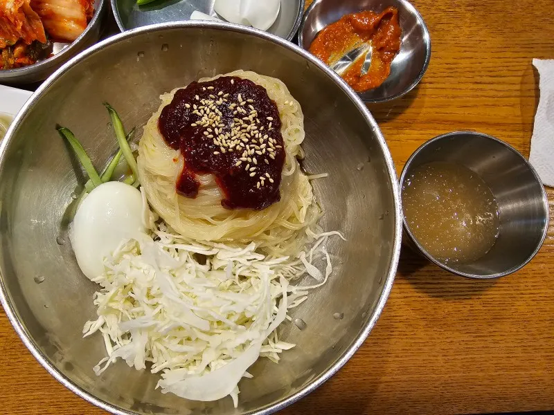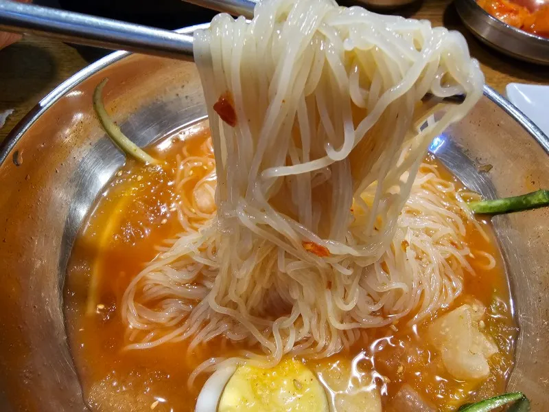 부산에서 유명하다는 음식점에서 밀면을 먹었을 때와는 약간의 맛의 차이가 있었지만, 면발의 쫄깃함이 살아 있어 먹는 즐거움을 줍니다.