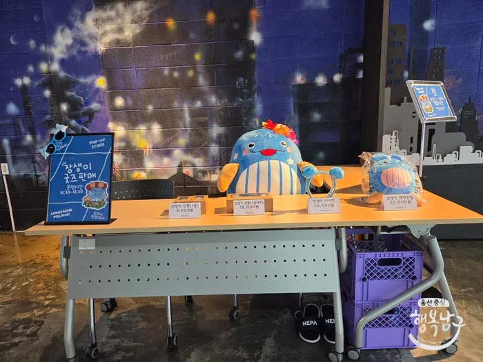 귀여운 굿즈 인형도 판매를 하고 있습니다. 울산 장생포 대표 캐릭터인 여러가지 고래 인형들이 많이 전시가 되어있어요.