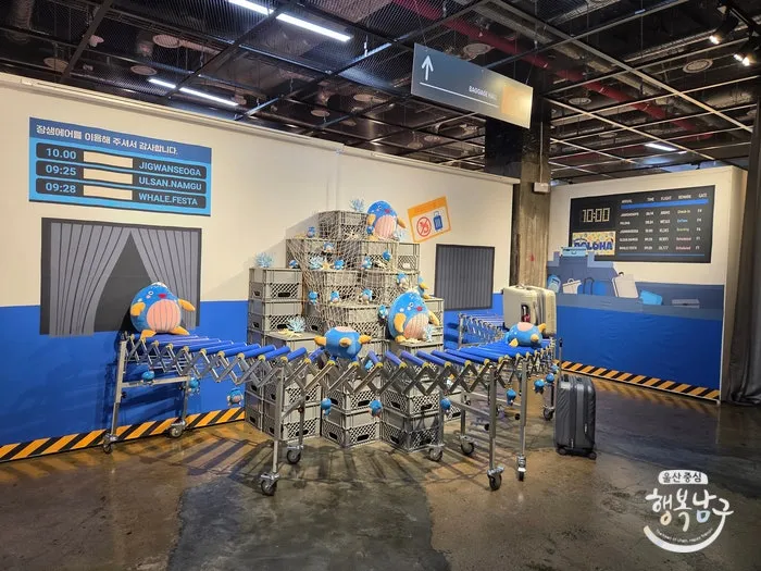 수화물을 붙이는 체험도 할 수 있습니다. 귀여운 고래 인형들이 반갑게 맞이해주네요.