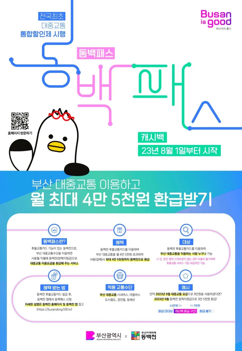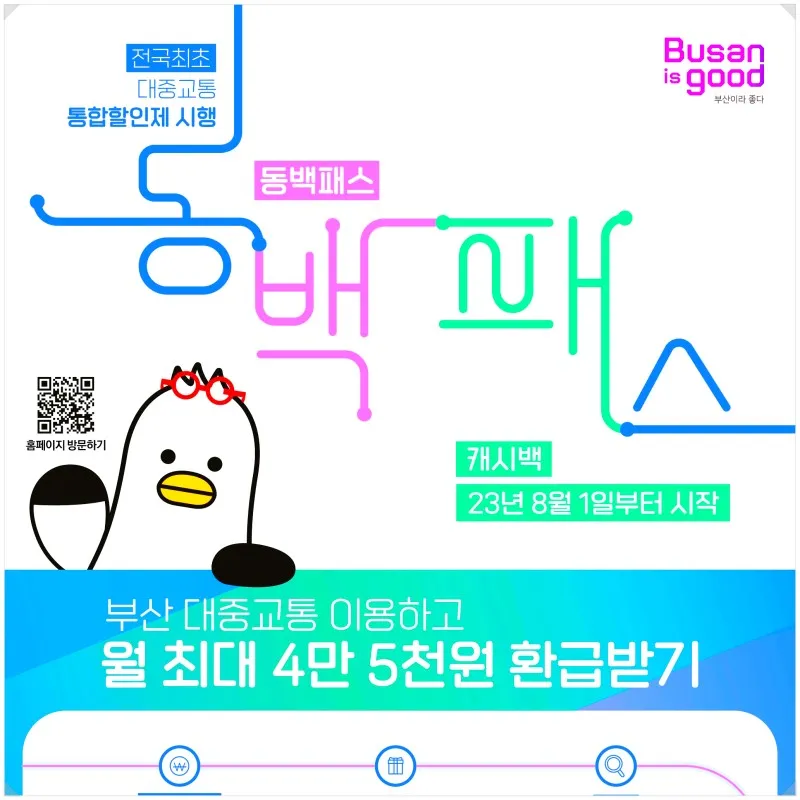 • 후불 교통카드 기능이 있는 동백전으로 부산 대중교통수단을 이용하면 사용월 익월에 동백전으로 대중교통 이용요금을 환급해주는 서비스