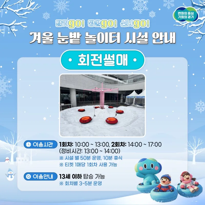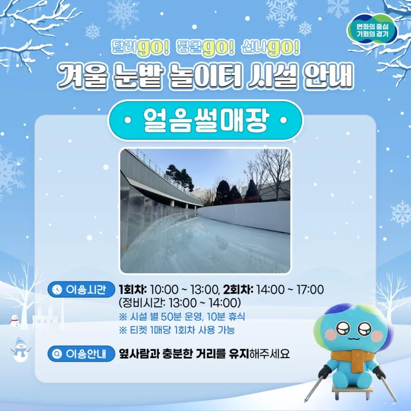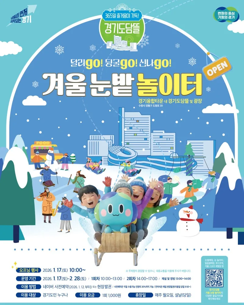 *운영기간: 2026.01.17.(토) ~ 02.28.(토) -휴장일: 매주 월요일, 설날 당일 (기상여건 악화시 추가 휴장) *운영시간 : 10:00 ~ 17:00(정비시간: 13:00~ 14:00) -1회차: 10:00~ 13:00 (네이버예약 150명, 최대 현장구매 350명 선착순) -2회차: 14:00~ 17:00 (네이버예약 150명, 최대 현장구매 350명 선착순) *장소: 경기도담뜰 일원(경기도 수원시 영통구 도청로 30) -매표소: 대형 눈썰매 슬로프 맞은편 *이용요금: 1,000원(1회 이용요금) -인터넷, 현장예...