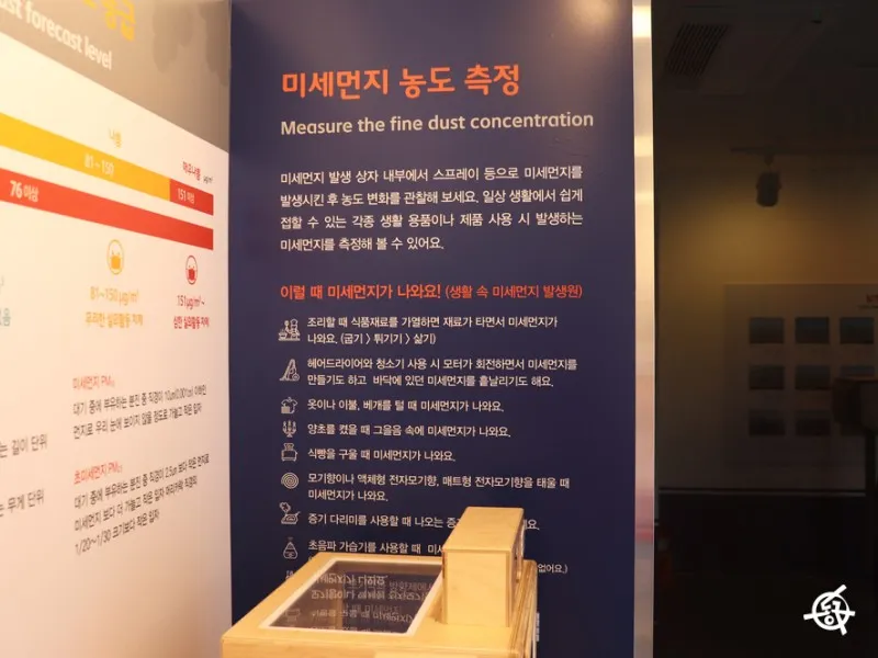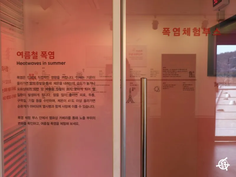 이용 시간 09:30~17:30 *미세먼지 1. 미세먼지 농도 측정 2. 눈으로 보는 미세먼지 3. 마스크 투과율 및 착용법 *폭염 1. 우리 주변 온도 측정 2. 여름철 폭염상황 체험 3. 뜨거운 열을 막아주는 기술 4. 폭염 속 자외선에게서 내 피부 지키기 *에필로그 함께하는 환경 서약 |