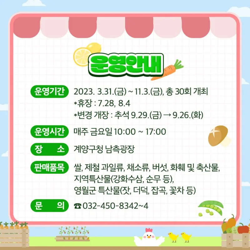 ◆ 운영기간 : 2023. 3.31.(금) ~ 11.3.(금), 총 30회 개최 * 휴장 7.28, 8.4 * 변경 개장 : 추석 9.29.(금) → 9.26.(화) ◆ 운영시간 : 매주 금요일 10:00 ~ 17:00 ◆ 장소 : 계양구청 남측광장 ◆ 판매품목 : 쌀, 제철 과일류, 채소류, 버섯, 화훼 및 축산물, 지역특산물(강화수삼, 순무 등), 영월군 특산물(잣, 더덕, 잡곡, 꽃차 등) |