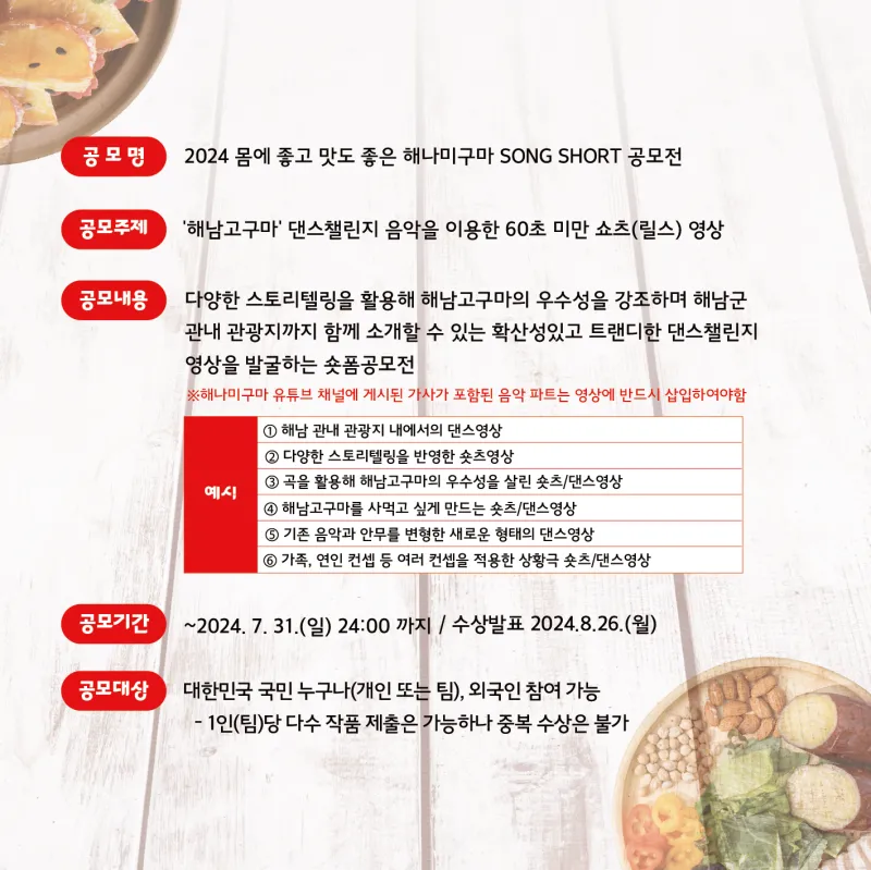 ✅ 공 모 명: 2024 몸에 좋고 맛도 좋은 해나미구마SONG SHORT 공모전