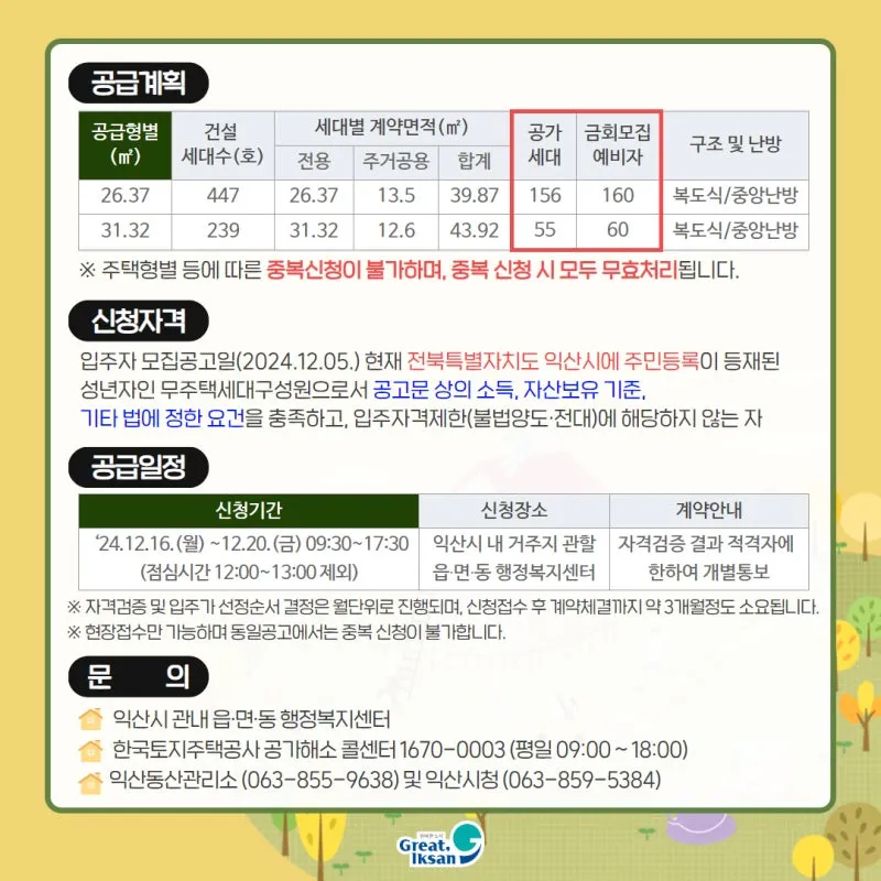 ✅ 신청자격 : 입주자 모집공고일(2024.12.05.) 현재 익산시에 주민등록이 등재된 성년자인 무주택세대구성원으로서