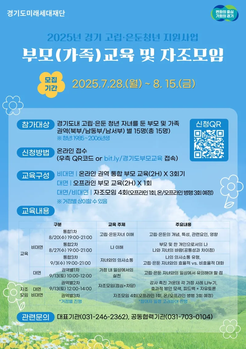 🍀 본 사업은 경기도와 경기도미래세대재단에서 진행하는 사업입니다. 🍀 외롭고 고립된 청년이 각자의 속도로 일상에 다가서고, ‘나와, 볼만한 세상’으로 이어지는 여정에 함께하고자 합니다. 🍀 여정에 함께해주실 '부모(가족)교육 및 자조모임' 참여자를 모집합니다. ◾ 신청기간: 2025. 7. 28(월) 09:00 ~ 2025. 8. 15(금) 17:00 ◾ 선정기준: 설문 결과 토대로 개별 연락 예정 ◾ 관련 문의 사항은 아래의 전화로 연락해주세요. (평일 09:00 ~ 17:00) 📞 사단법인 파이나다운청년들(사업 수행기관)...