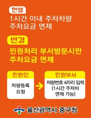 중구청 내 1시간이내 주차차량 요금면제 ➡ 민원처리 부서방문시만 주차요금 1시간 면제