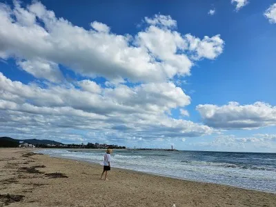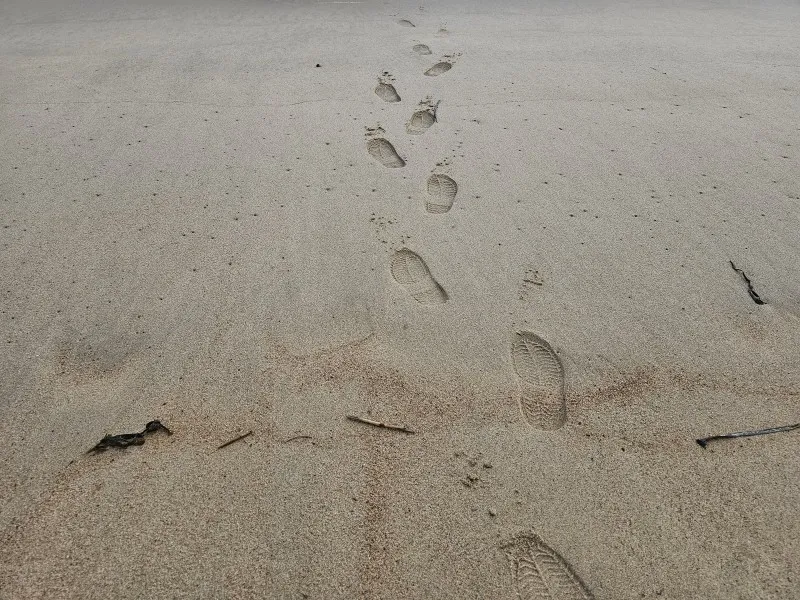 모래사장을 걸으며 다양한 생각에 빠져듭니다.