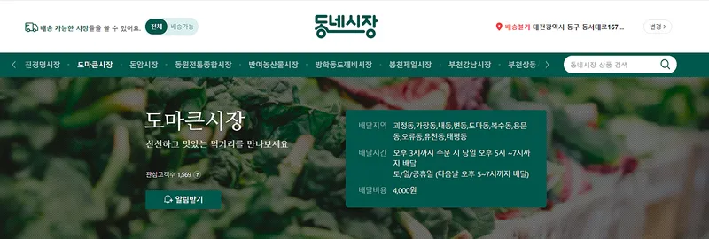 도마큰시장에 방문하기 어려운 분들은 네이버 장보기를 통해서도 도마큰시장의 상품을 구매하실 수 있습니다. 단, 모든 지역에서 가능한 것은 괴정동, 가장동, 내동, 변동, 도마동, 복수동, 용문동, 오류동, 유천동, 태평동만 가능하니 주소지를 확인하시고 주문해 주세요.