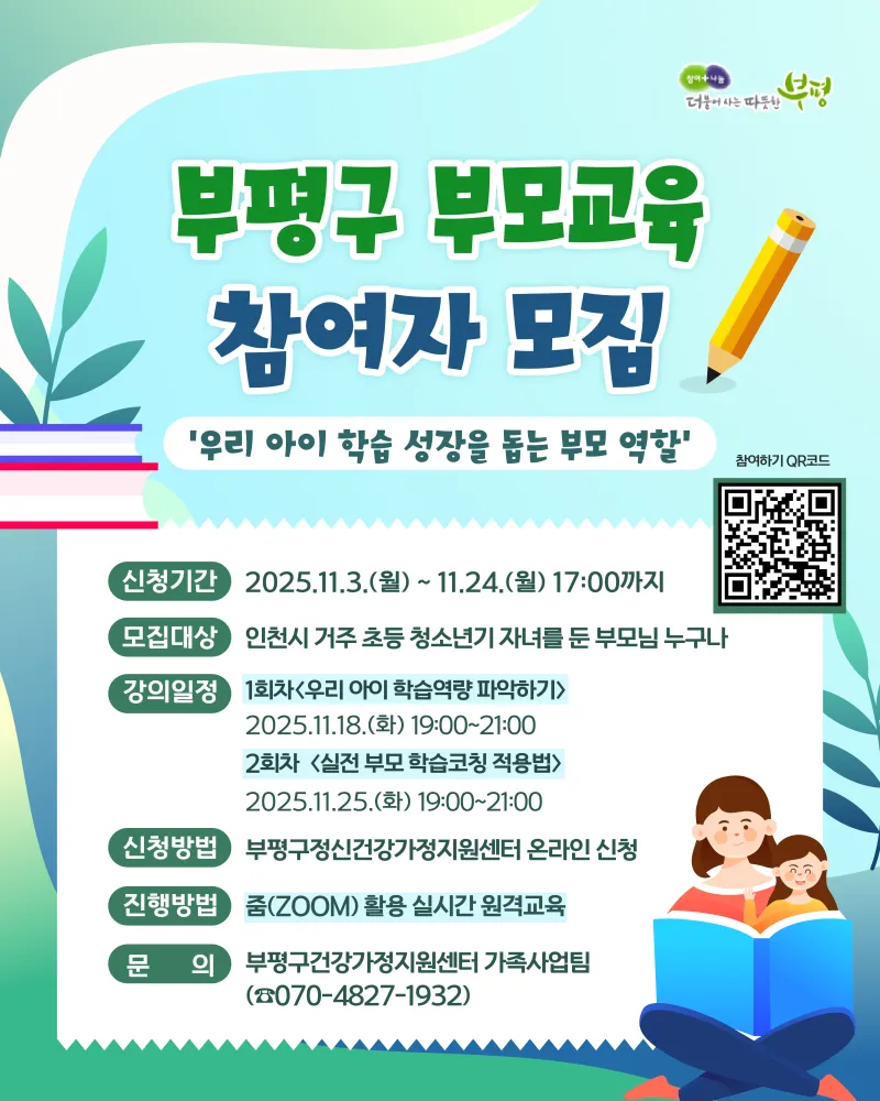 부평구, 부모교육 '우리 아이 학습 성장을 돕는 부모 역할' 참여자 모집 안내