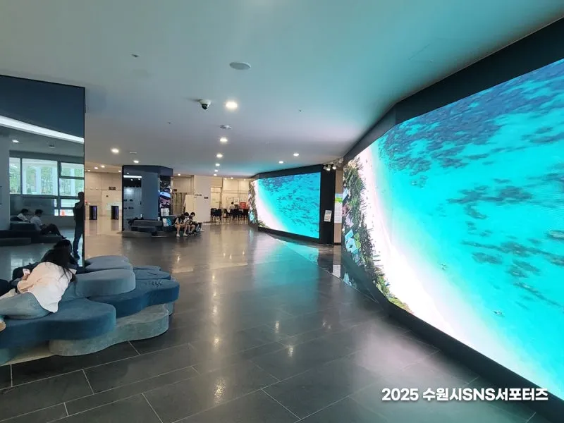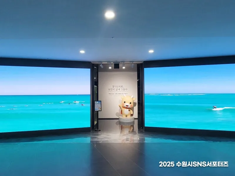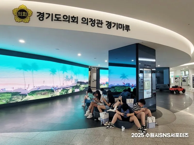 경기마루 의정기념관으로 들어가는 입구 좌·우측에 대형 화면이 나오고 있는데, 여름이라 그런지 시원한 바닷가 영상이 파노라마로 펼쳐집니다. 웅장한 대형 LED와 도민이 편하게 앉아 쉴 수 있는 공간으로 구성돼 있습니다.