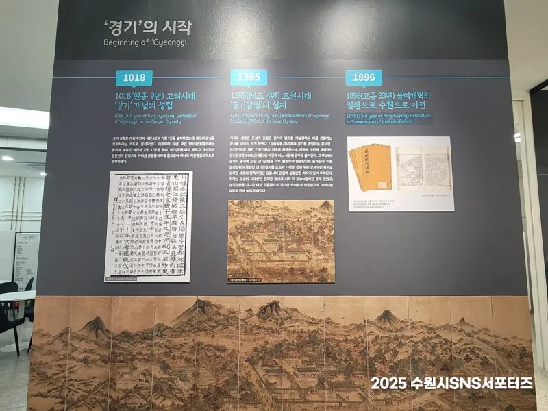경기도의회의 역사를 다 소개할 수는 없지만, 경기의 시작이 1018년 고려 현종 9년이며, 1395년(태조 4년) 조선시대 경기감영이 설치되었습니다. 그리고 1896년(고종 33년) 을미개혁의 일환으로 경기도청이 수원으로 이전한 역사가 있습니다.