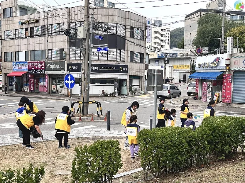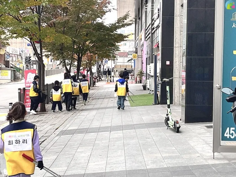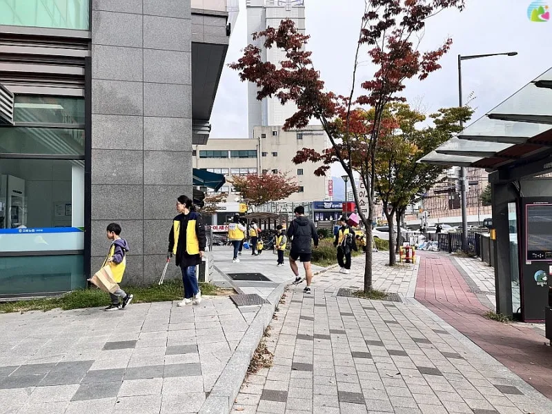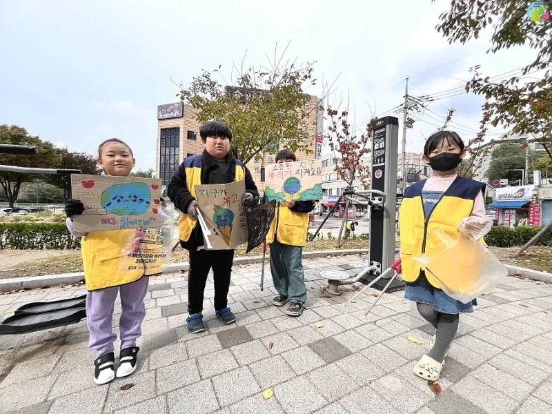 아파트 주변 쓰레기를 줍고 캠페인을 열며