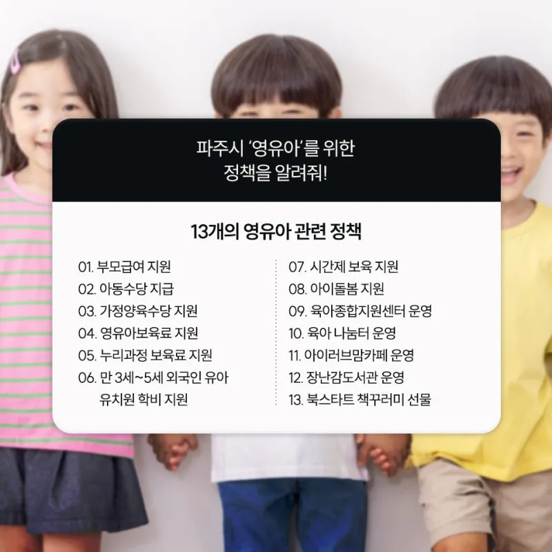파주시에는 총 13개의 영유아를 위한 정책이 마련되어 있습니다.
