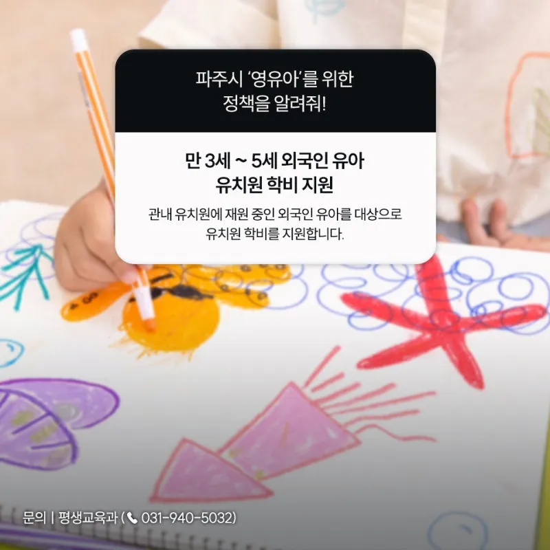 유치원 학비를 지원하여 외국인 가정의 육아부담 경감에 기여합니다.