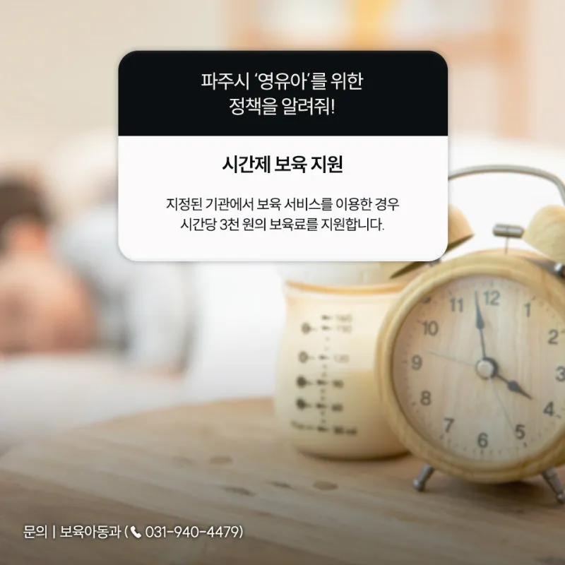 가정양육을 하는 경우에도 지정된 기관에서 시간단위로 보육서비스를 이용하고 이용한 시간만큼 보육료 지불 ◾ 운영 시간 : 평일 오전 9시 ~ 오후 6시(공휴일 제외) ◾ 지원 시간 : 월 80시간 ◾ 지원 단가 : 시간당 3,000원(본인부담 시간당 1,000원) |