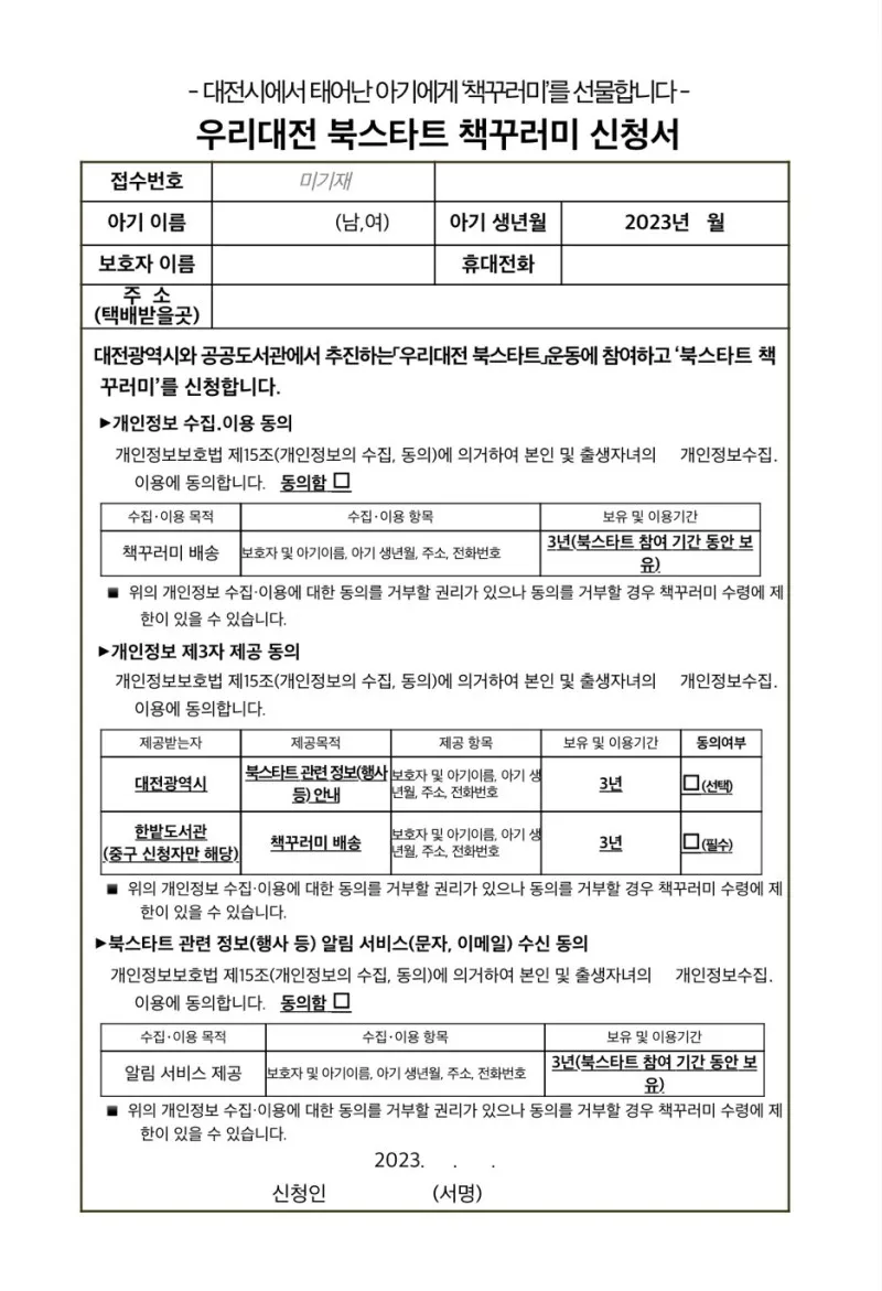2023년 대전 소셜미디어 기자단 중 유일한 임산부 기자로서 대전시 출생등록 아기를 대상으로 대전시에서 태어난 모든 아기에게 그림책 책꾸러미를 선물하는 ‘2023 우리대전 북스타트’ 혜택을 알려 드리려 합니다.