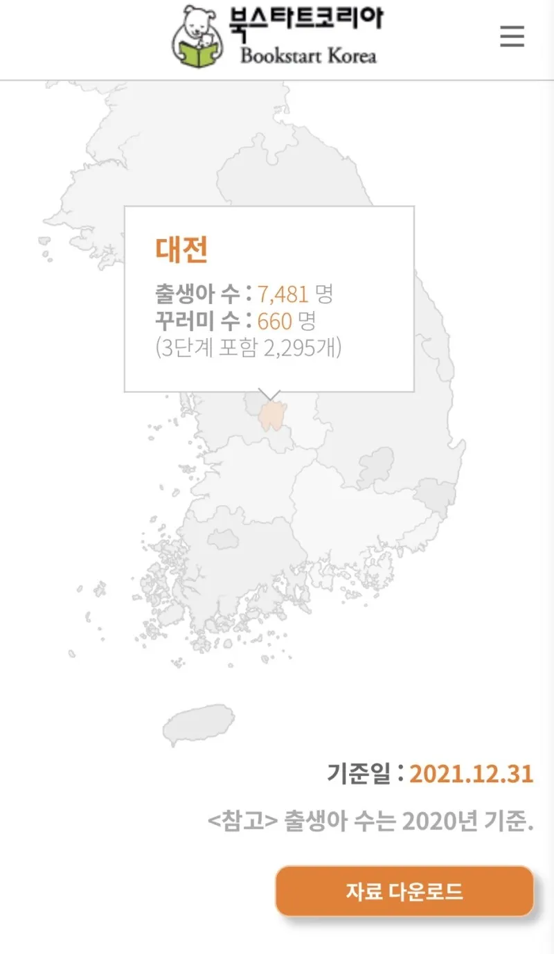 2020년 출생아 수 기준 대전 출생아 수는 약 7천 400명이지만, 2021년 북스타트 신청은 단 660명 뿐이라 북스타트 배포율이 9%에 그칩니다.