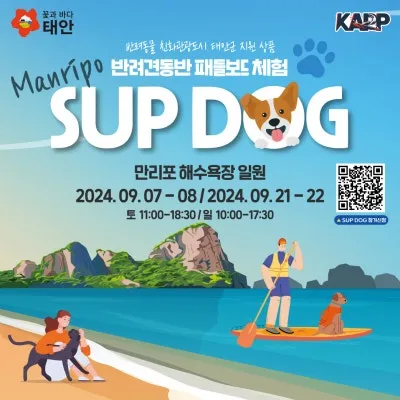 만리포해수욕장에서 즐기는 반려견 동반 패들보드 체험은 태안군 지원 상품으로 1인 SUP부터 BIG SUP까지 참가비 1만 원으로 반려견과 함께 수상 스포츠와 도가, 음악캠프 등 다양한 애견동반 프로그램을 즐길 수 있어 반려견과 함께 특별한 시간을 보낼 수 있답니다.