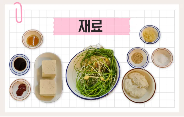 달래, 밥 한 공기, 두부 반 모, 다진 마늘, 간장 2T, 고추장 1T, 소금, 참기름, 통깨