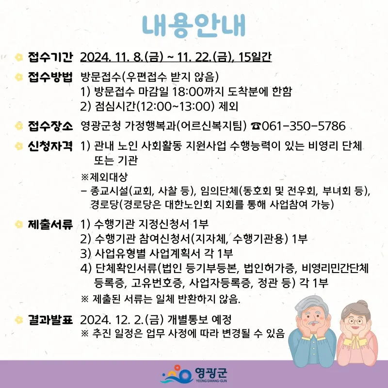 2025년도 영광군의 어르신들을 위한 일자리 창출에 같이 참여할 기관을 모집합니다.