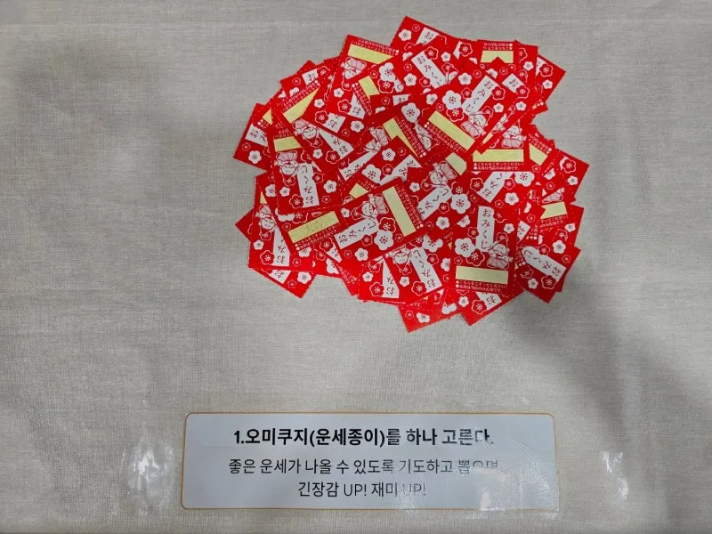 즉석 복권처럼 대길(大吉), 중길(中吉), 길(吉), 소길(小吉), 흉(凶) 5가지 운세가 적혀있는 오미쿠치(운세종이)를 골라 긁으면