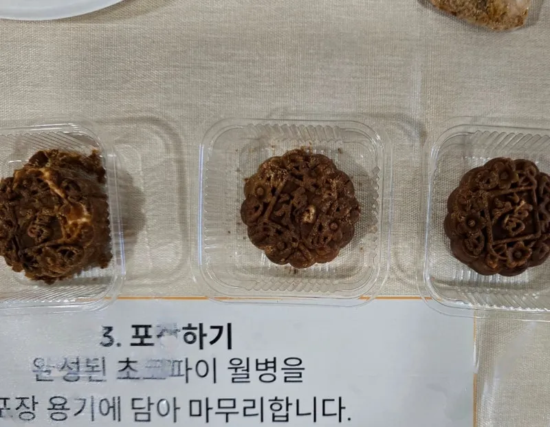 초코파이를 봉지에 넣어 으깨 뭉쳐서 도장으로 무늬를 찍으면 월병이 완성됩니다.