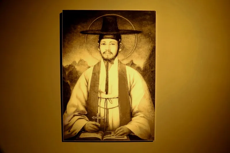 나바위성지 역사관에 들어가면 입구에 김대건신부 영정이 자리잡고 있고