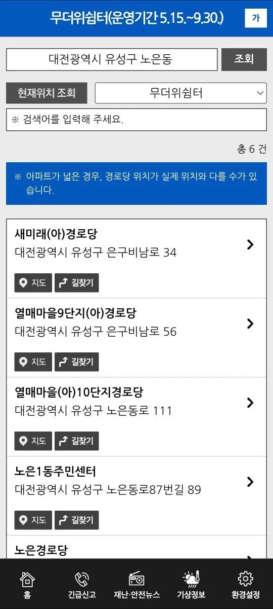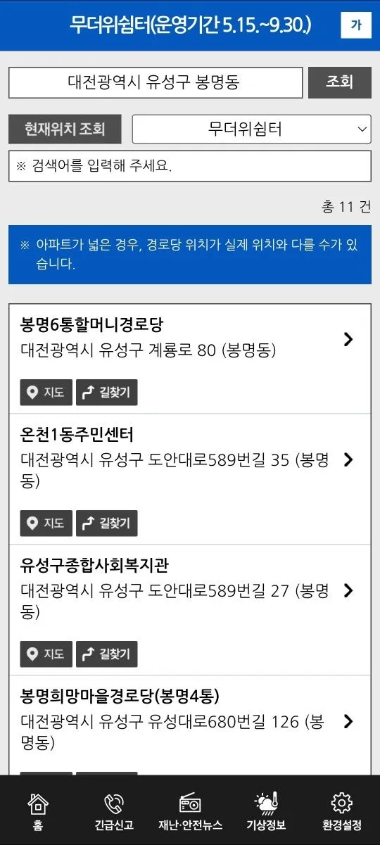 또 다른 유성구의 무더위 쉼터를 찾을 수 있는 방법은 행정안전부 안전 디딤돌 앱을 활용하는 방법입니다. 안전 디딤돌 앱에 접속하여 무더위 쉼터를 조회하면 무더위 쉼터로 지정된 주민센터, 경로당 등의 위치를 쉽게 확인할 수 있습니다.
