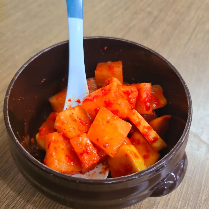 반찬으로 덜어먹을 수 있는 깍두기가 작은 항아리에 담겨 나와 덜어먹기 편리했습니다.
