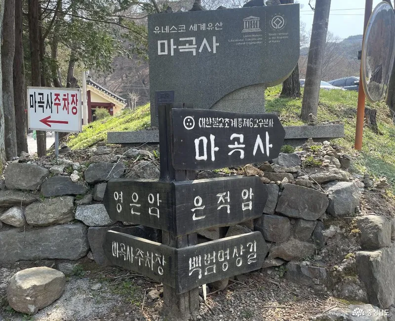 사찰로 들어서는 입구에는 세계문화유산임을 알리는 공식 표식을 확인할 수 있다. 이 표식은 마곡사의 역사적·문화적 가치를 상징적으로 보여주는 동시에, 이곳이 단순한 종교 공간을 넘어 세계가 인정한 문화유산임을 말해준다.