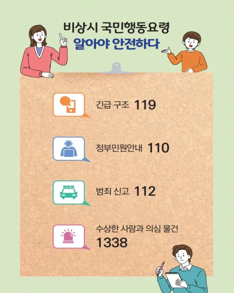 긴급 구조: 119 정부 민원 안내: 110 범죄 신고: 112 수상한 사람과 의심 물건: 1338 |