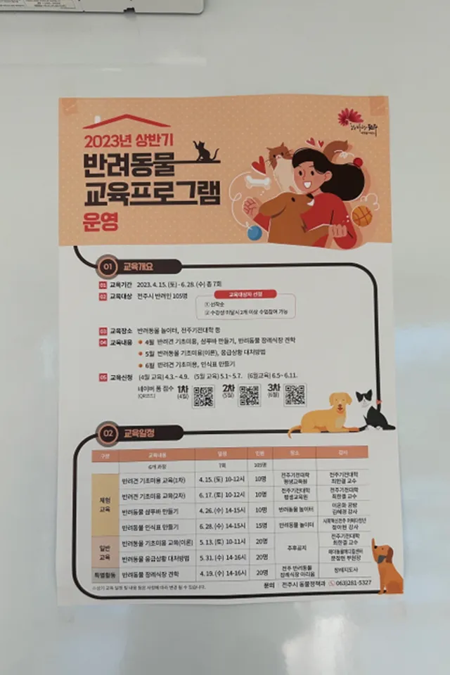 찾아가는 무료 내장형 동물등록의 날 외에도, 전주시에서는 다양한 반려동물 관련 프로그램을 운영하고 있습니다. 반려인들은 일정표를 참고하시어, 자신에게 필요한 프로그램이 있으면 참가해 보시는 걸 추천합니다.