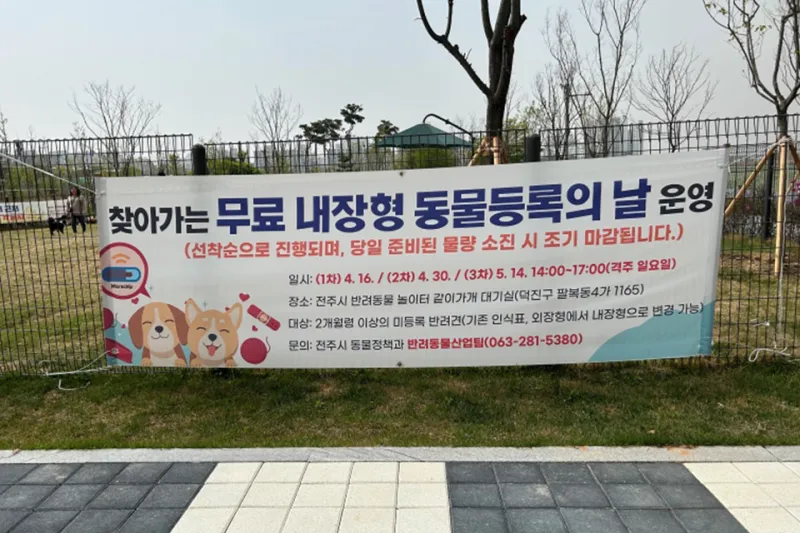 주택, 준주택에서 기르거나 그 외의 장소에서 반려 목적으로 기르는 월령 2개월 이상인 개들은 동물등록제가 필수인데요, 전주시 동물정책과 반려동물산업팀에서 '찾아가는 무료 내장형 동물등록의 날'을 운영한다고 합니다. 전주시 반려동물 놀이터 '같이가개' 대기실에서 진행한다고 해서 반려견과 함께 산책 겸 방문해 보았습니다.