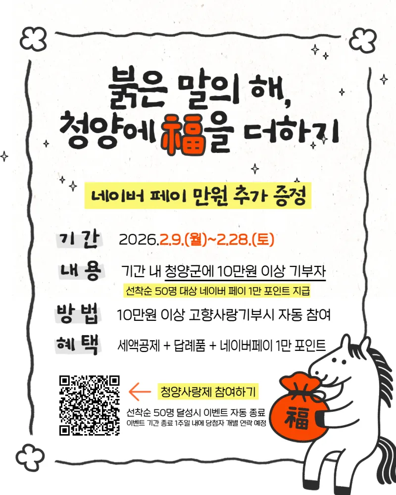 [청양군] 2026 붉은 말의 해, 고향사랑기부하고 네이버 페이 1만 원 더 받으세요!