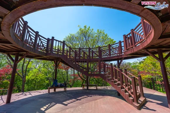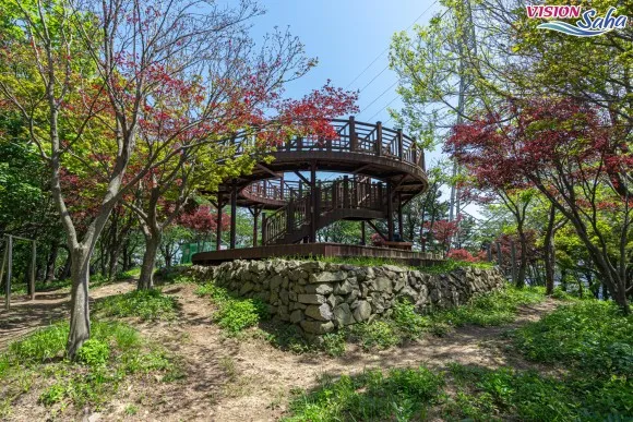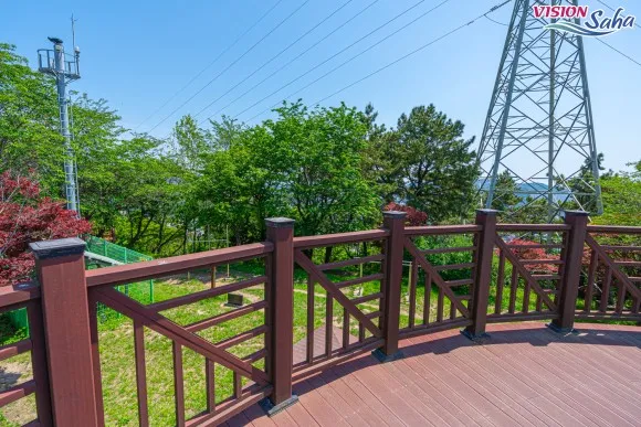 아쉽게도 지금은 원형 전망대 주변을 둘러싼 나무들이 푸르른 잎들로 감싸여 있어 아쉽게도 주변 풍경은 보기 힘들었지만, 겨울에 방문하신다면 앙상한 나뭇가지 틈으로 낙동강과 다대포 앞바다가 이루는 멋진 풍경을 만나볼 수 있는 곳인데요.