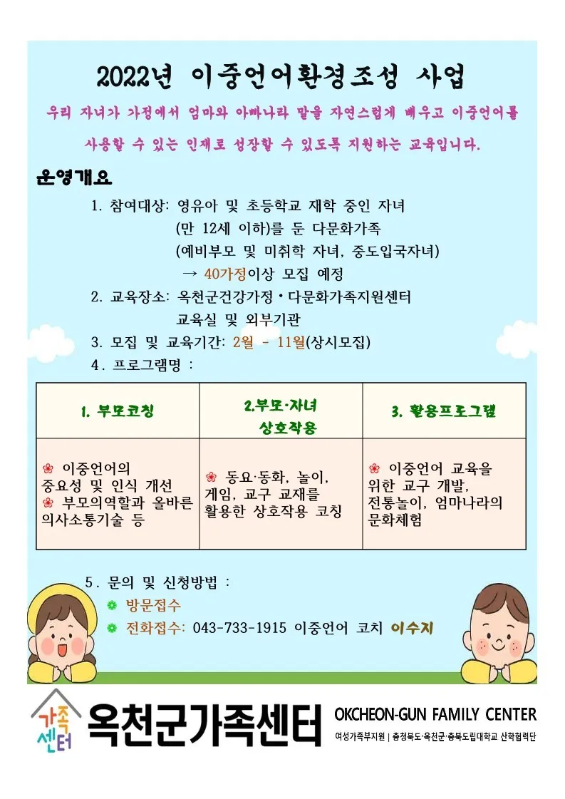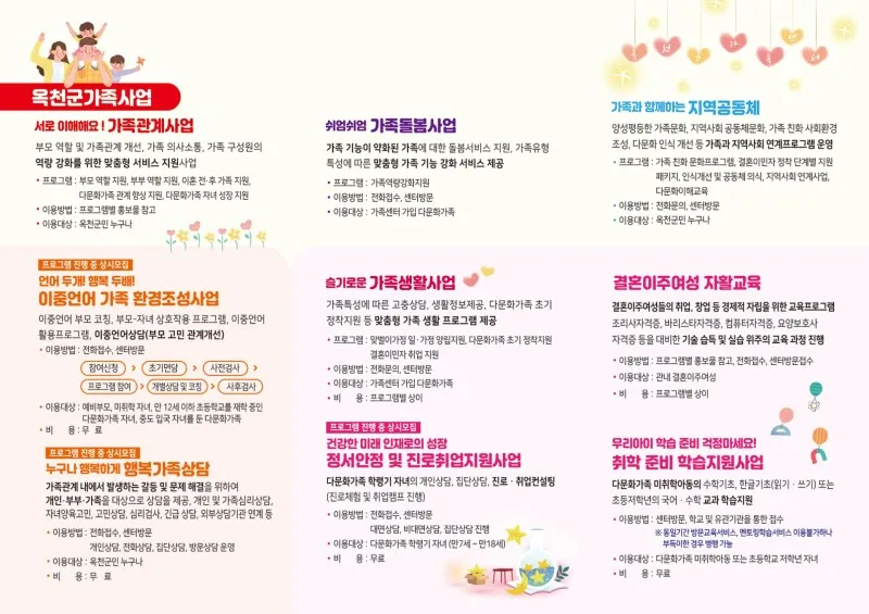 옥천군가족사업, 아이돌봄지원사업, 다문화가족 특성화사업 등을 운영합니다.