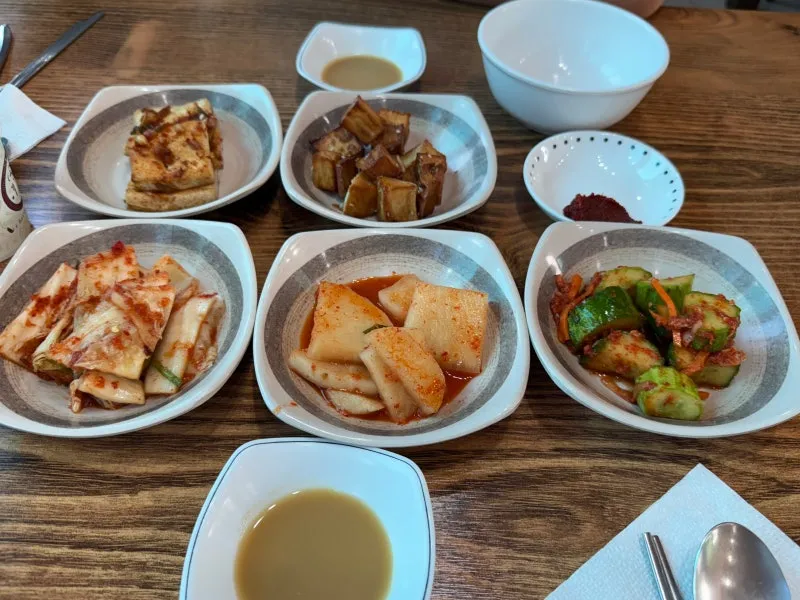 기본 반찬부터 정성 가득! 김치, 깍두기, 양념두부 등 다양한 반찬이 함께 나와요.