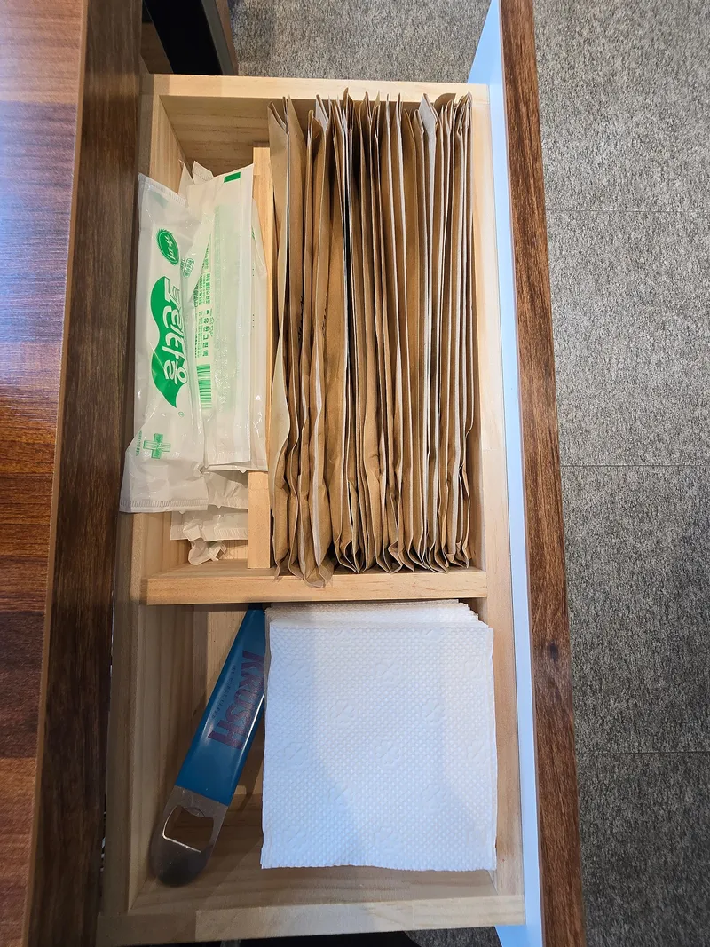 서랍 옆에 수저, 오프너, 냅킨이