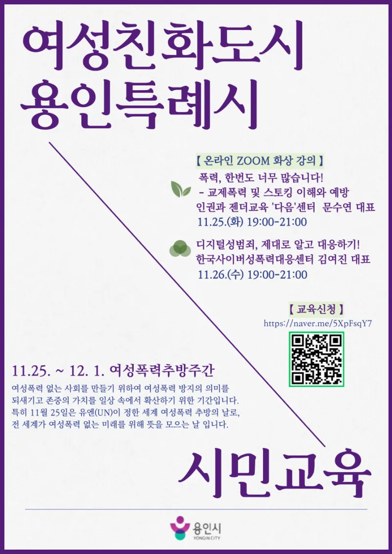 [용인소식] 2025년 "여성폭력 추방주간" 여성친화도시 시민교육 (3차) 신청 안내