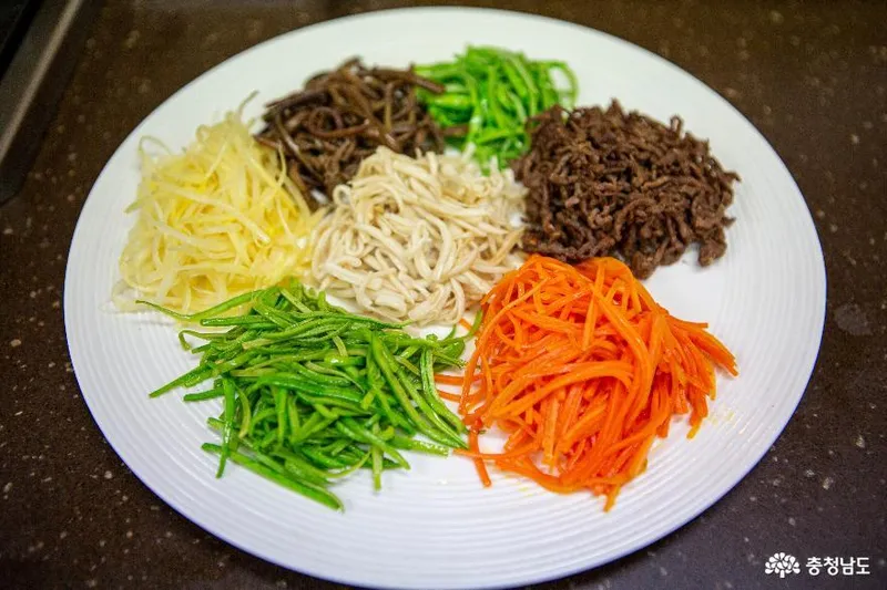 2. 새송이버섯, 애호박, 오이, 당근을 채를 썰어 소금에 살짝 절인 뒤 볶고, 도라지를 채를 썰어 소금에 절인 후 찬물에 헹궈 수분을 제거합니다.